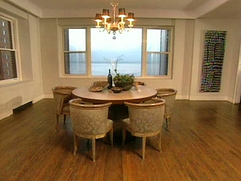 The dining room is spare. With that view, who needs drapes?? And, like Nate, my personal (unpopular?) choice is to NOT place an area rug under a dining table. Way cleaner, and it allows the hardwood flooring to be the star. Makes the room look bigger, too.