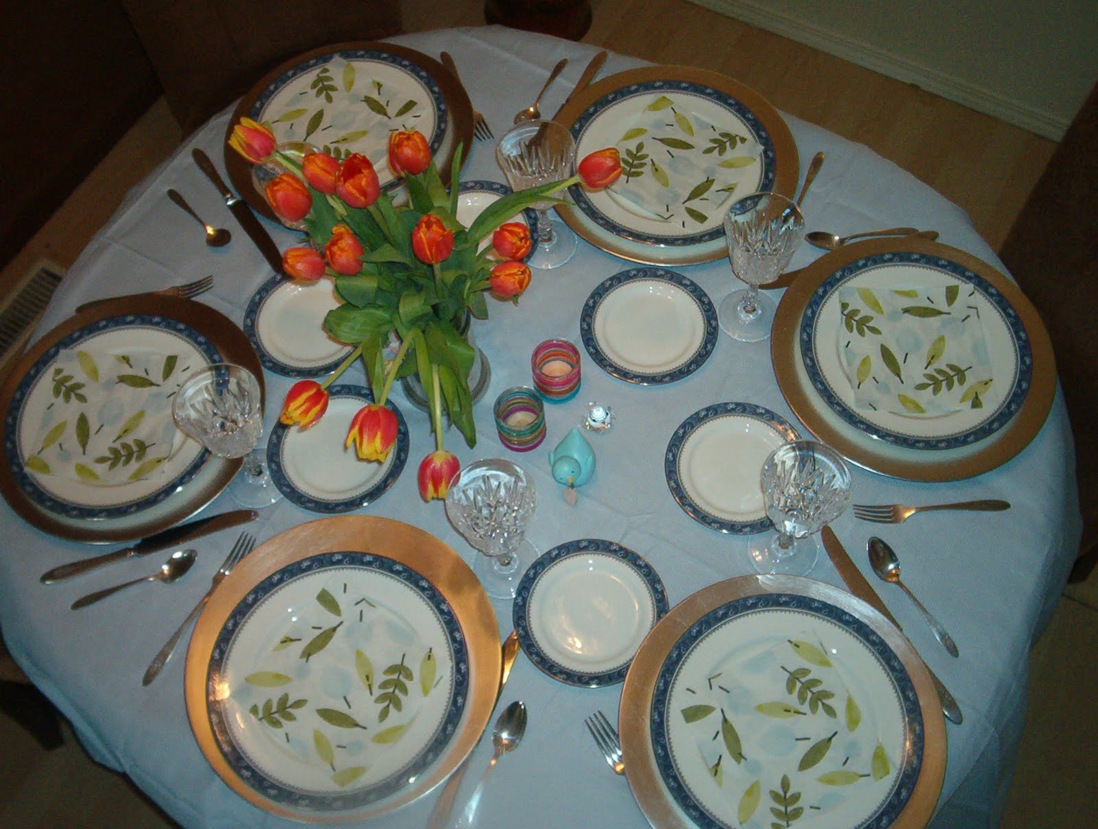 Ta Da! Here is the final tablescape! Photo courtesy of Jack. Thanks, Jack. I love you.Blue Mist china by Aynsley (now defunct - yes, that's how long ago my wedding was), silverware - antique pattern called Birds of Paradise, collected for me by my mother-in-law, Mila crystal by RCR, now defunct (see comment above), napkins and tablecloth by Superstore, and tulips by Safeway. Birds (blue, from Wal-Mart years ago, and crystal one by Swarovski - talk about mixing it up!)
