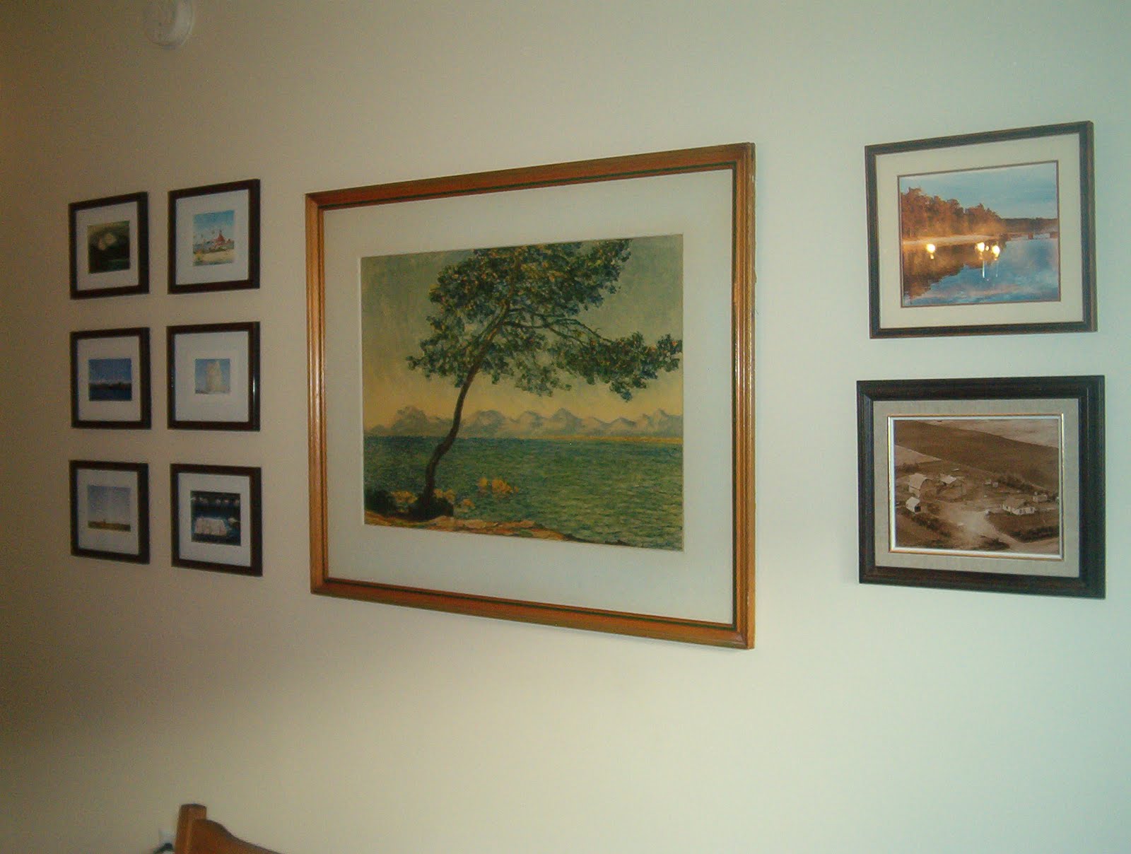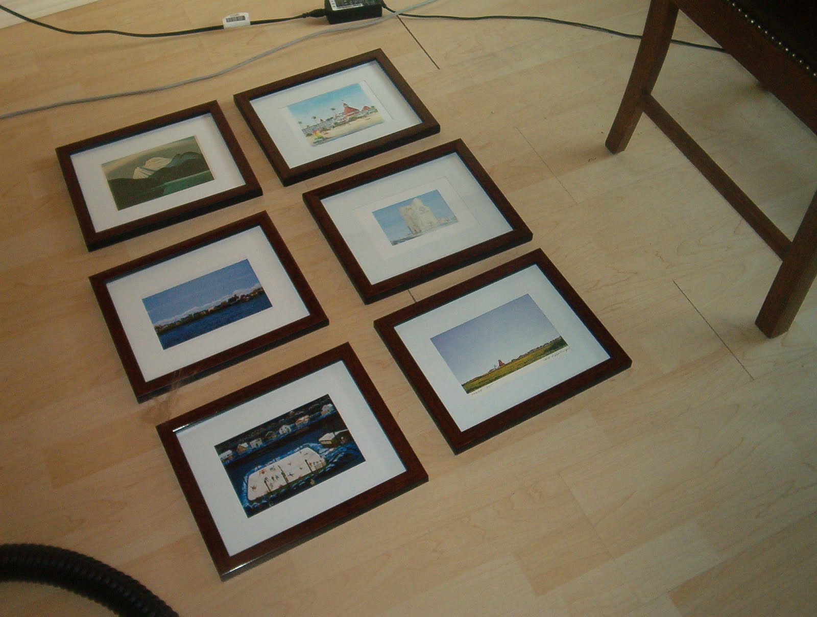 Lots of watery greens and blues. Very tranquil.I had also collected many postcard-sized prints over the years. There was a distinctly "blue" theme that connected them. Funny how that can happen. So I decided to treat the six prints as one large piece of art. I found six identical frames (including mats) for $2 each at Walmart. I love that! Here is the arrangement on the ground. I fooled around with it til I got a pleasing layout.