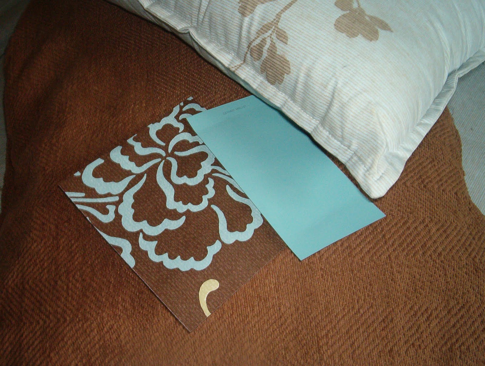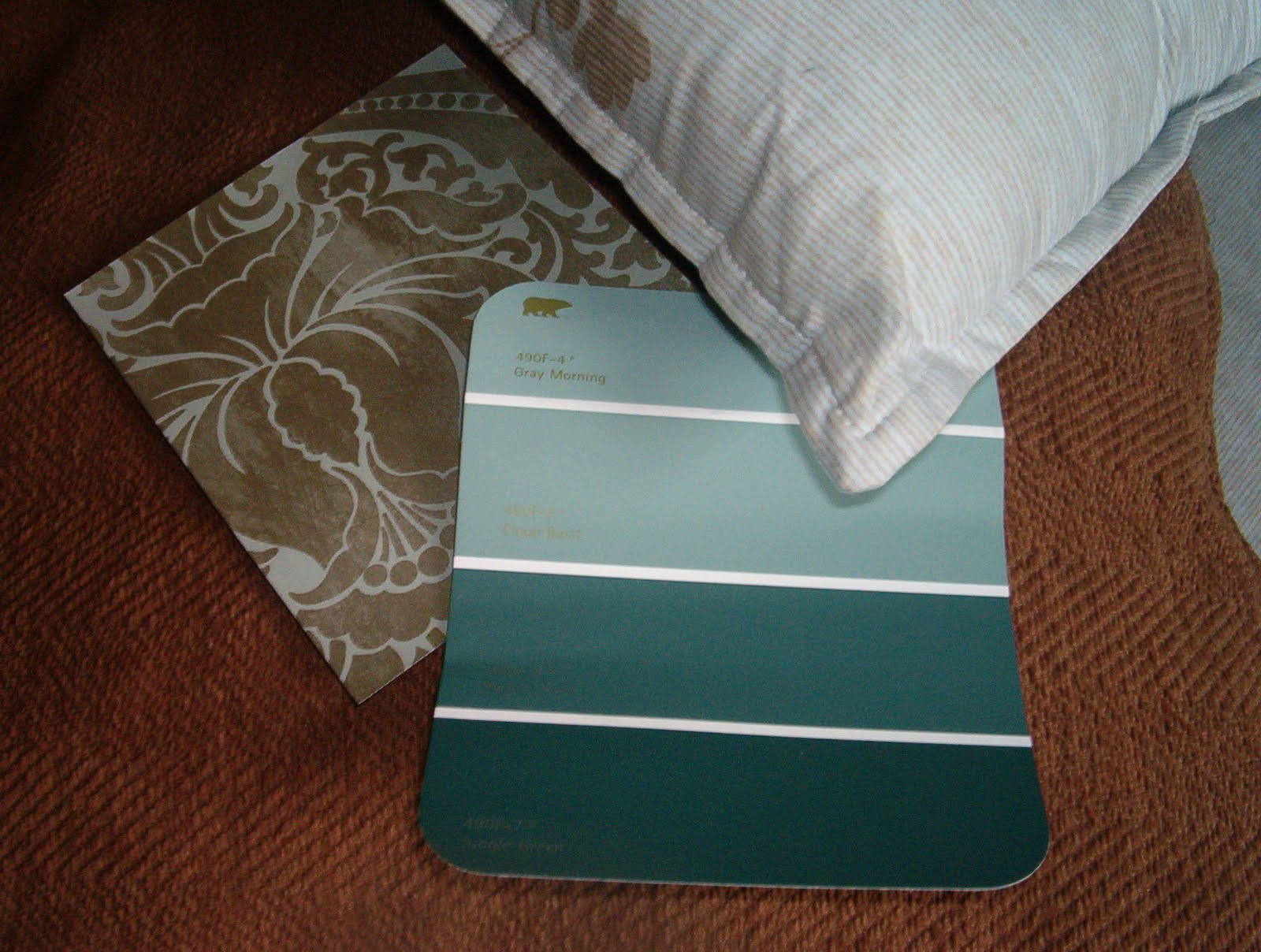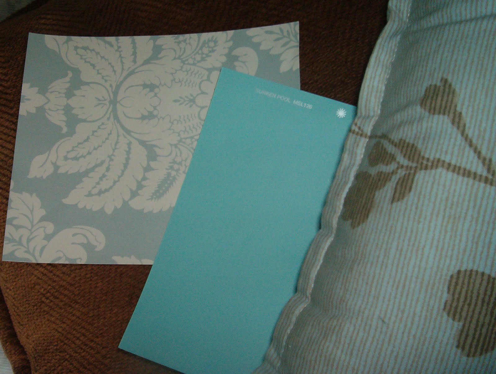 The wallpaper is shiny and sophisticated. A little "upscale". The second photo features a paint chip by "Behr". The top colour is called "Gray Morning 490F-4". This is the chip suggested by Home Depot/Behr colour matching system. I placed the accent pillow in the machine and this is what I got. Not bad, considering it is pretty hard to match blue with brown stripes! But I am still having my love affair with turquoise...