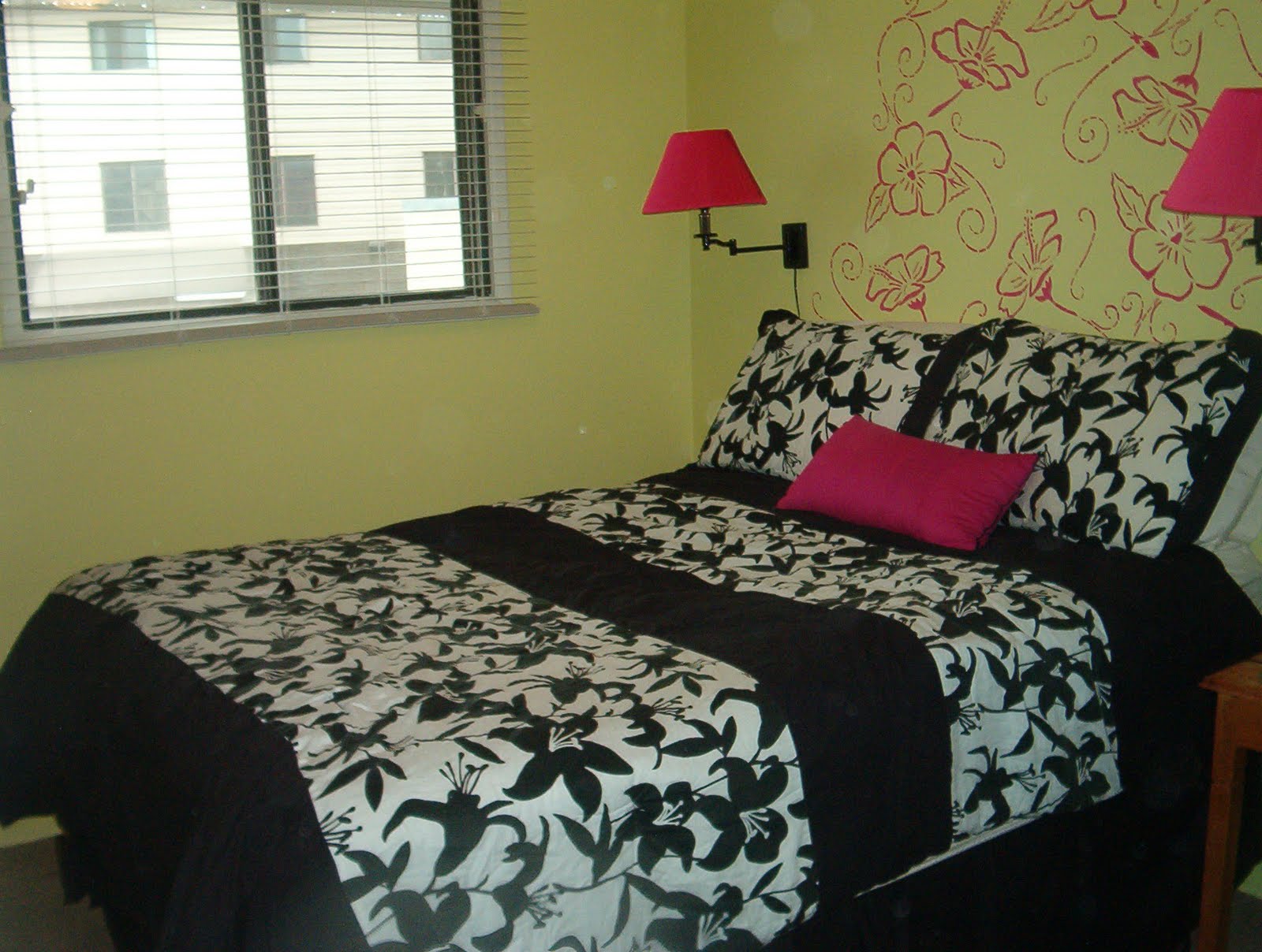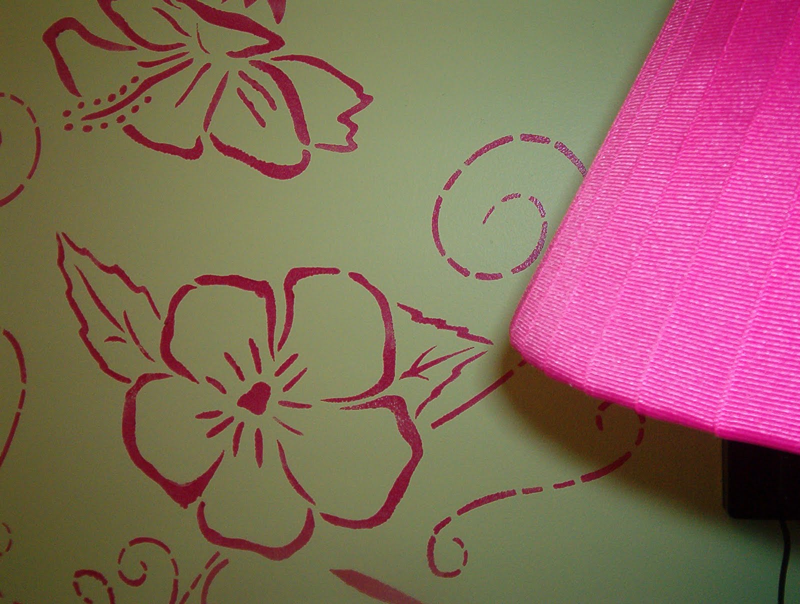 We decided the small room could use a focal point, so we decided to use a wall tattoo (which is just another name for a huge stencil) from Benjamin Moore as a "headboard". (She doesn't like real headboards; I guess we all have our quirks). We decided the colour could be a fuschia as a counter point to the black, white and green. We had an existing can of paint in that colour.