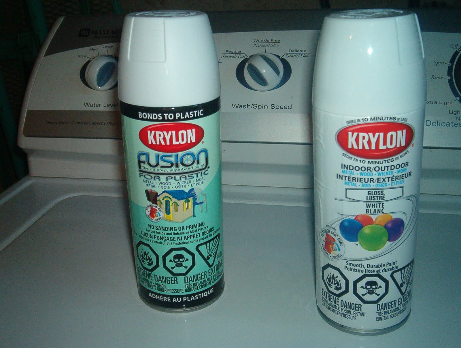 You may be able to see I couldn't decide which type to buy. I ended up using both - the one on the left first as a "primer" and then the right one as a glossy white finish coat. Each can cost $5.I started by washing the headboard thoroughly with TSP and rinsing with clear, clean water. I didn't let it get too wet. Then I let it air dry overnight.