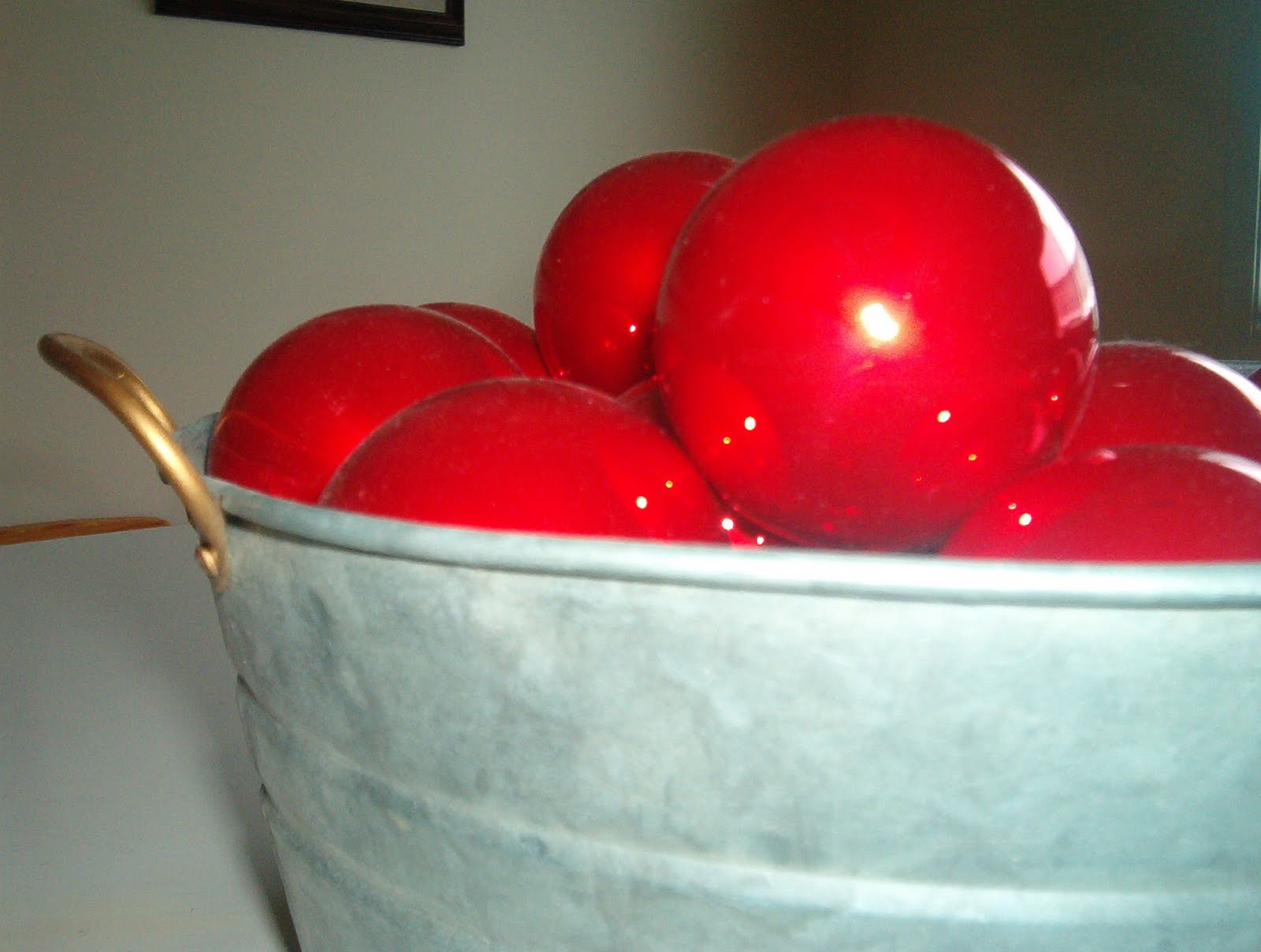 While I am not the biggest fan of the commercialization of Christmas, I did manage to create a few decorating vignettes around the house. I love the juxtaposition of the glossy red balls against the rustic tin pail on my breakfast nook table.