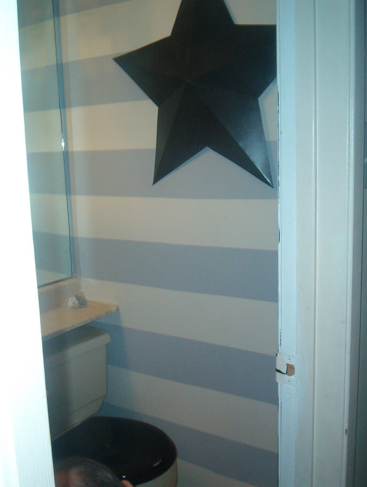 The powder room on our main floor is very, very tiny. It measures a scant 47" deep by 52" wide and that includes a vanity, the toilet and a door that swings IN. However, it is also an important room as it is right at the front door, and it is likely the only bathroom a visitor will see. As the rest of the house is a neutral backdrop, I wanted the powder room to have visual impact. I first came home with some awesome orange grasscloth wallpaper. The verdict? Three thumbs down from the family. They wanted NO orange and NO wallpaper. I then thought that stripes would be a good idea. I also decided to paint them because paint is much less of a commitment than wallpaper. The verdict? Come on, my peeps! This girl is no slow learner...I didn't ask them!As I love the beachy look, I went with blue and white stripes. I decided to paint the background in BM Cloud White. I already had a 4litre/gallon of it at home because I painted all the closets in it. I also had a litre/quart of blue paint I have already mentioned here. It is called BM Iced Slate and it was a $4 mistint at the local BM retailers. The colour was tinted correctly but the finish was wrong for the previous client - so her loss, my gain!