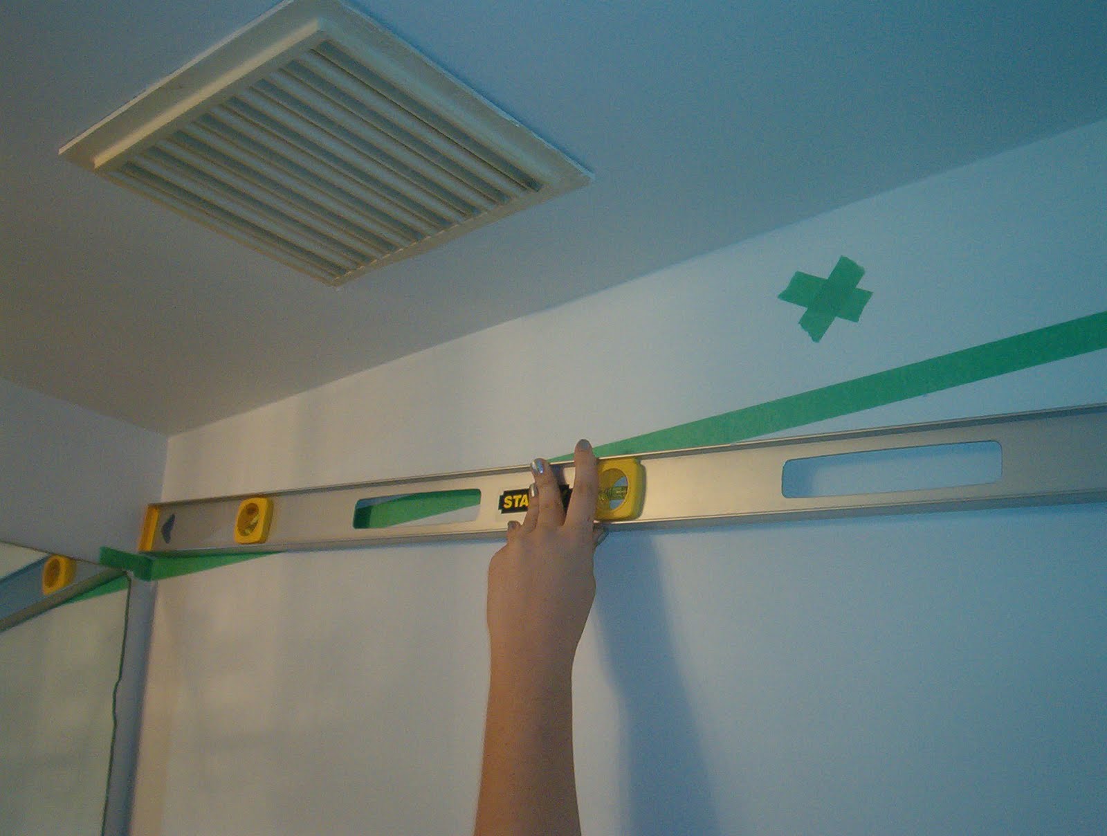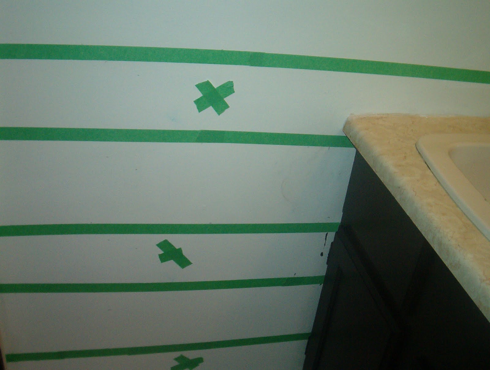 The hardest part of this project was definitely the math. I knew I wanted the top stripe AND the bottom stripe to both be white (the background AND the ceiling colour). This just made it easier to paint. And (in theory) easier to calculate. Math is not my strong point. I mean, I can do my own taxes and figure out a tip, but math like this is beyond me. Like, way way beyond me. In a galaxy far, far away. But I finally (sorta) figured it out. I knew I needed an odd number of stripes. I found out that the ceiling in the powder room was shorter than the rest of the house. I had never noticed that before. I ended up calculating that each stripe needed to be 6.5 inches and a bit. So I measured 6.5" and "eye-balled" the difference. Professional carpenters and painters are wincing right now.
