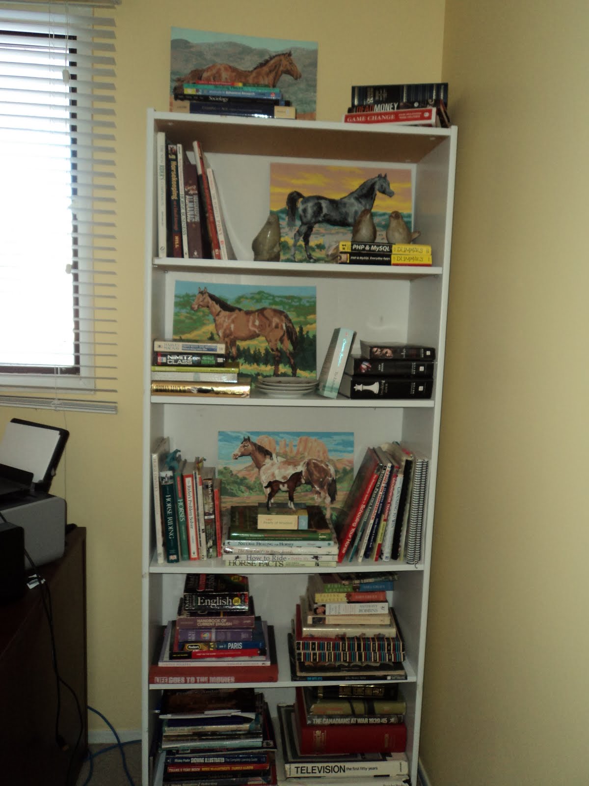 As you all very well know, there is a specific reason why my daughter is called "The Horsey Girl" - she totally loves horses! A few years ago, I picked up a couple of paint by number kits to keep her busy. Way better than TV or video games. She painted these several years ago (and, yes, that IS her work, above) and they are well-done, vibrant and interesting to look at. PBN have gone in and out of fashion, but there seems to be a resurgence in the decorating world. When I was researching this topic on the internet, I found the Smithsonian actually had an exhibit on them! Cool! There are also lots of places to buy the kits OR the finished product online. I read a blog several months ago and the writer was searching for vintage PBNs of ships for her house - sorry I can't find it again. (Let me know if you can!).H.G. has many books on horses and horse care and the logical place to keep them was in our office bookshelf. I placed the paintings behind the books for an interesting visual display. I love the personality they give to the shelves.