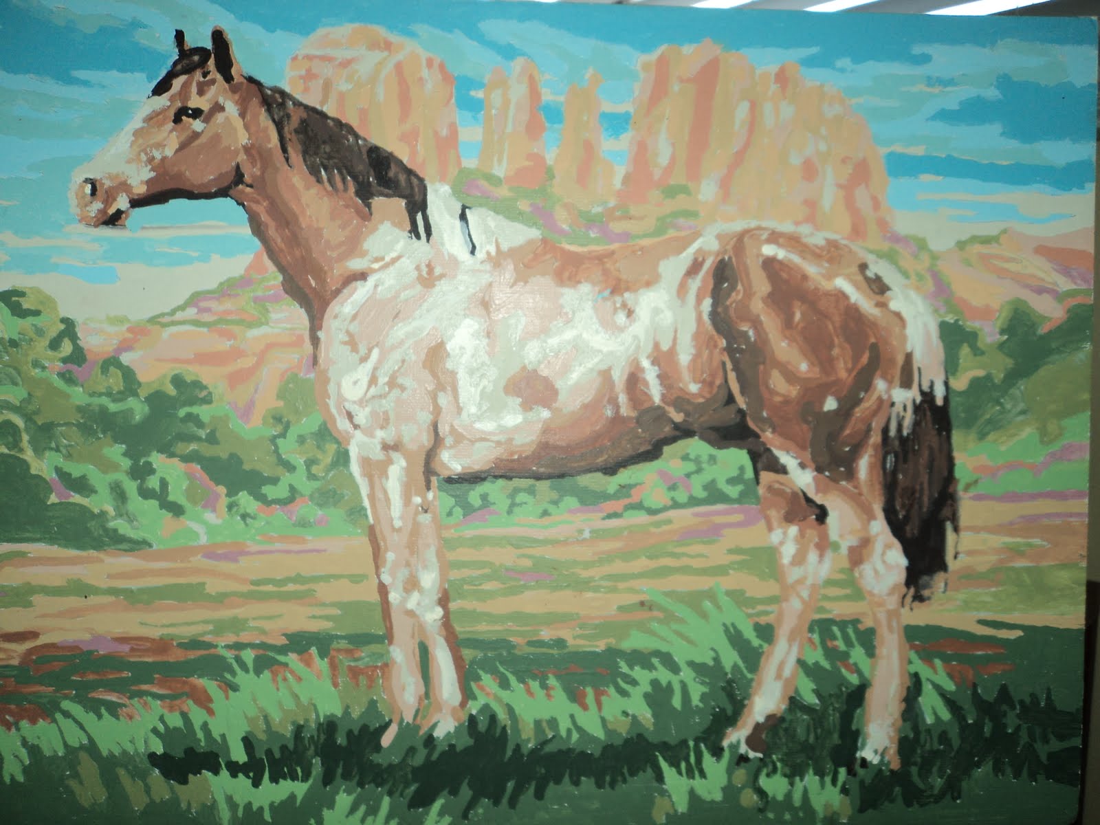 As you all very well know, there is a specific reason why my daughter is called "The Horsey Girl" - she totally loves horses! A few years ago, I picked up a couple of paint by number kits to keep her busy. Way better than TV or video games. She painted these several years ago (and, yes, that IS her work, above) and they are well-done, vibrant and interesting to look at. PBN have gone in and out of fashion, but there seems to be a resurgence in the decorating world. When I was researching this topic on the internet, I found the