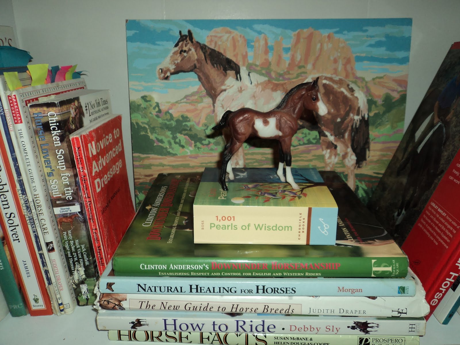 H.G. has many books on horses and horse care and the logical place to keep them was in our office bookshelf. I placed the paintings behind the books for an interesting visual display. I love the personality they give to the shelves.