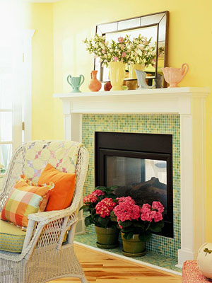This is my inspiration photo from bhg.com for my fireplace. Except with Carrara Marble tile and gray walls.