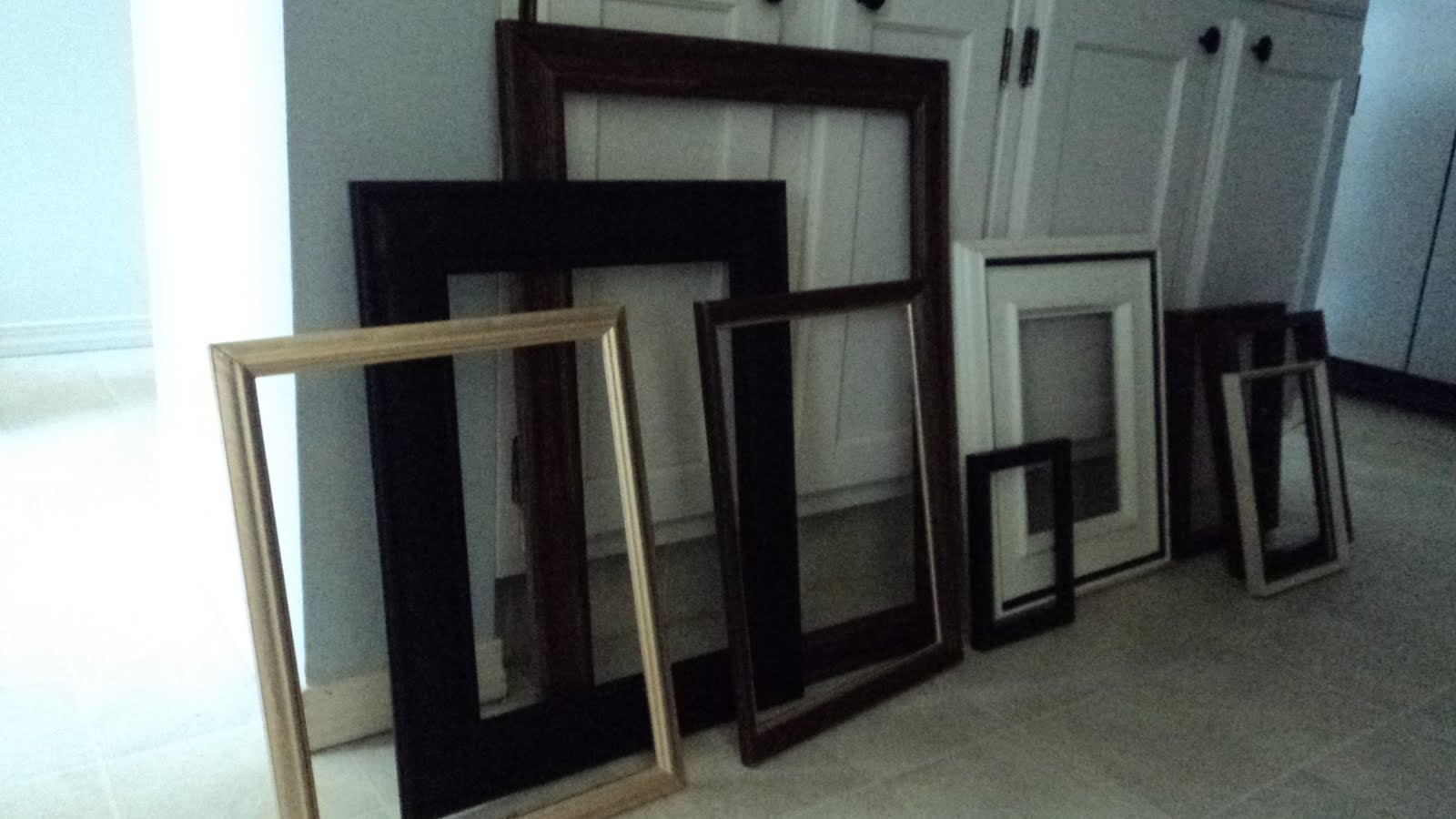 I had frames stored in the basement - some empty and some filled with "beautiful" 80s images of flowers. Yes, that is how long I have been moving them house to house. Don't judge me. But I didn't have nearly enough. My goal was to "NEVER PAY RETAIL". I found most of the rest of the frames at Goodwill for under a buck each. Then I spray-painted each frame in Tremclad Gloss White and the mattes in flat white. Confession time: I did end up paying FULL RETAIL PRICE for some frames. I was at the dollar store and found 4x6 frames with a double mat already in white, so I bit the bullet and spent the $2 each for 6 frames. Sue me.