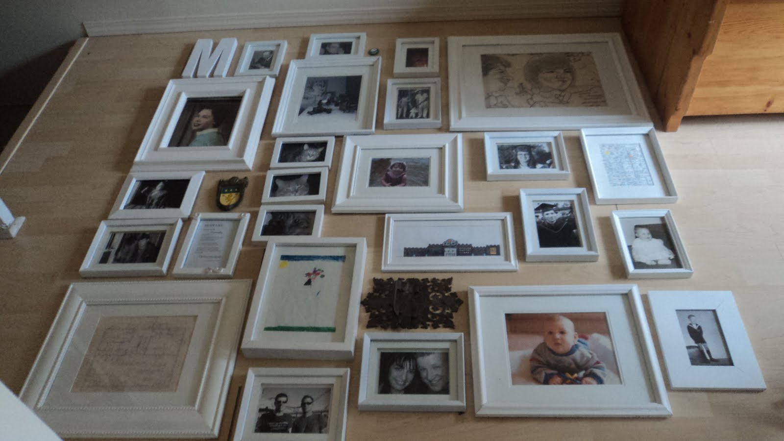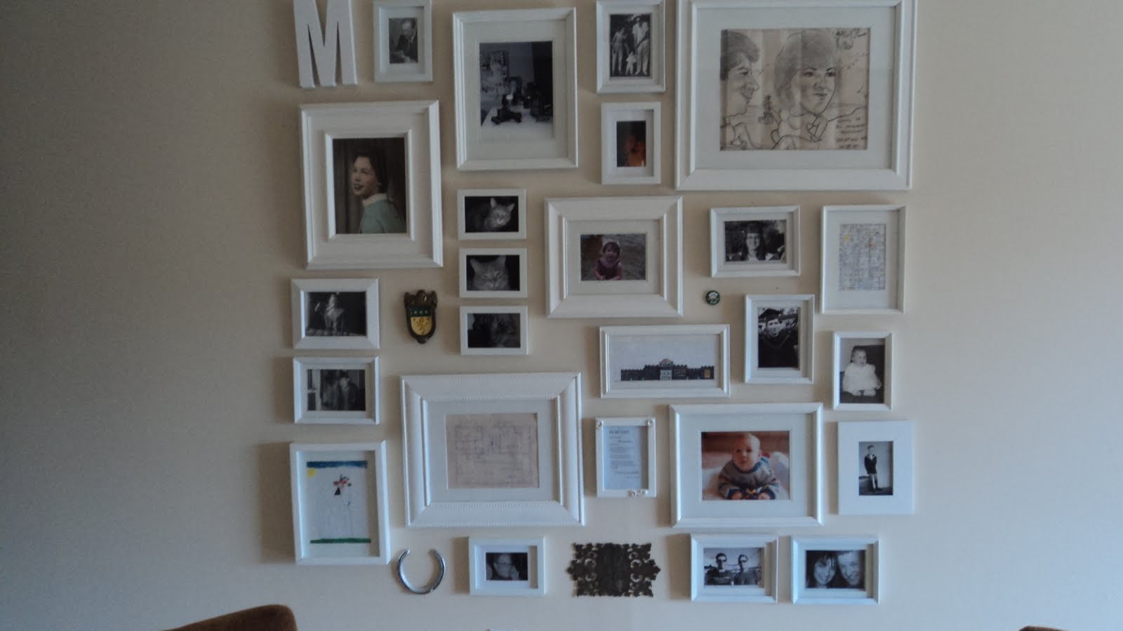 You will notice I also used items that were not photos. This was to add interest and to pay homage to items that had been stored in boxes for decades. Seriously. Decades. I included a door knocker with Jack's family crest, the handles from his TV cabinet growing up - on which he saw the Beatles on Ed Sullivan, the M represents our last name, I have 2 pieces of my children's artwork (even though they're grown up), the lyrics to