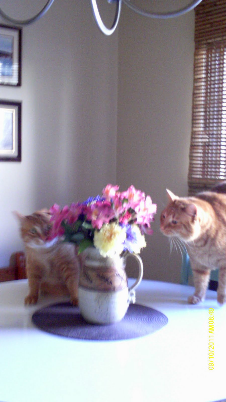 P.S. In the spirit of full-disclosure, here is what was going on while I was trying to get the shot. By the way, cats are NOT allowed on tables in this household. The flowers were too much of an allure!