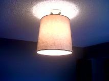 The "new" light fixture in my master bedroom! I spotted the lonely lampshade in Goodwill with the textured wallpaer (like grasscloth) and a cute velvet trim attached to the bottom. It was only $2! You heard me - two bucks! Add a $16 light kit from Home Depot and presto!